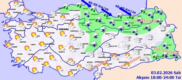 Meteoroloji Genel Müdürlüğü, 3 Şubat Salı günü için kritik hava durumu raporunu paylaştı. Yurdun büyük bir kısmında kar ve sağanak yağışın tesirli olacağı belirtilirken, birtakım bölgelerde kar yağışının 4 gün boyunca aralıksız süreceği iddia ediliyor.