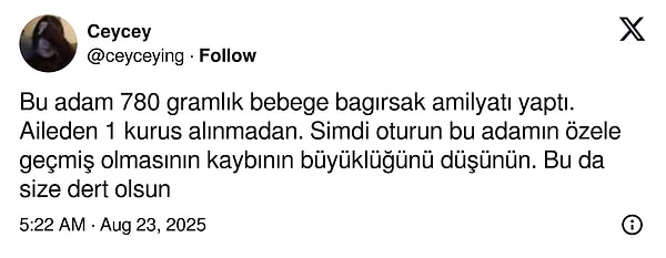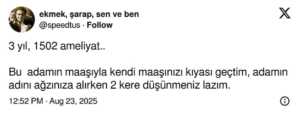 ‘Bu adam 780 gramlık bebeğe bağırsak ameliyatı yaptı. Aileden 1 kuruş alınmadan. Artık oturun bu adamın özele geçmiş olmasının kaybının büyüklüğünü düşünün. Bu da size kaygı olsun.‘