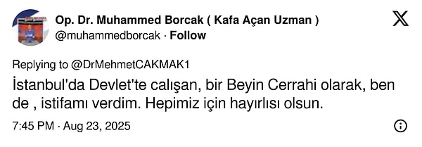 ‘İstanbul’da devlette çalışan, bir beyin cerrahi olarak, ben de istifamı verdim. Hepimiz için iyisi olsun.’
