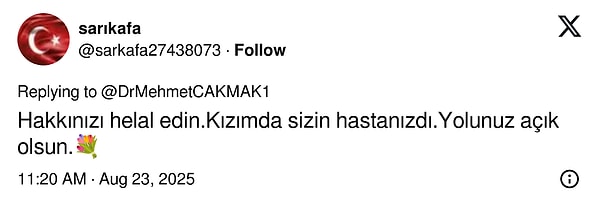 ‘Hakkınızı helal edin.Kızım da sizin hastanızdı. Yolunuz açık olsun.‘