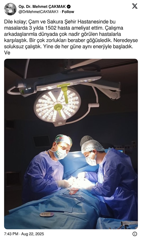 ‘Dile kolay; Çam ve Sakura Şehir Hastanesinde bu masalarda 3 yılda 1502 hasta ameliyat ettim. Çalışma arkadaşlarımla dünyada çok az görülen hastalarla karşılaştık. Bir çok zorlukları bir arada göğüsledik. Neredeyse soluksuz çalıştık. Tekrar de her güne birebir güçle başladık. Ve istemesem de ayrılık günü geldi çattı. İstanbul’daki masraflara devletteki maaş yetmediğinden devlet hastanesinden ayrılmak zorunda kaldım. Takibini yaptığım tüm hastalarım kendilerinden rastgele bir karşılık beklenmeksizin istedikleri vakit bana toplumsal medyadan ileti yoluyla ulaşabilirler. Sıhhatine bir nebze dokunup yararım olan tüm hastalarıma ve hasta yakınlarıma sağlıklı bir ömür dilerim.‘