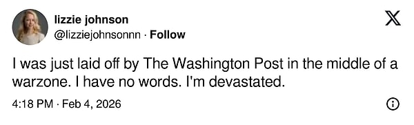 ‘Savaşın tam ortasında The Washington Post tarafından işten çıkarıldım. Söyleyecek kelamım yok. Yıkıldım.‘