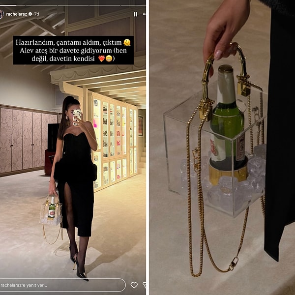 Geçtiğimiz saatlerde bir davete katılmak üzere süslenip püslenen Rachel Araz, kombinini paylaştıktan sonra takipçilerinden bilhassa çantasına bakmalarını rica etti. Buz kovası içindeki şampanya biçimindeki çantası, ‘bir bu eksikti’ dedirtirken, bu çantaya kaç bin lira servet döktüğü merak konusu oldu.