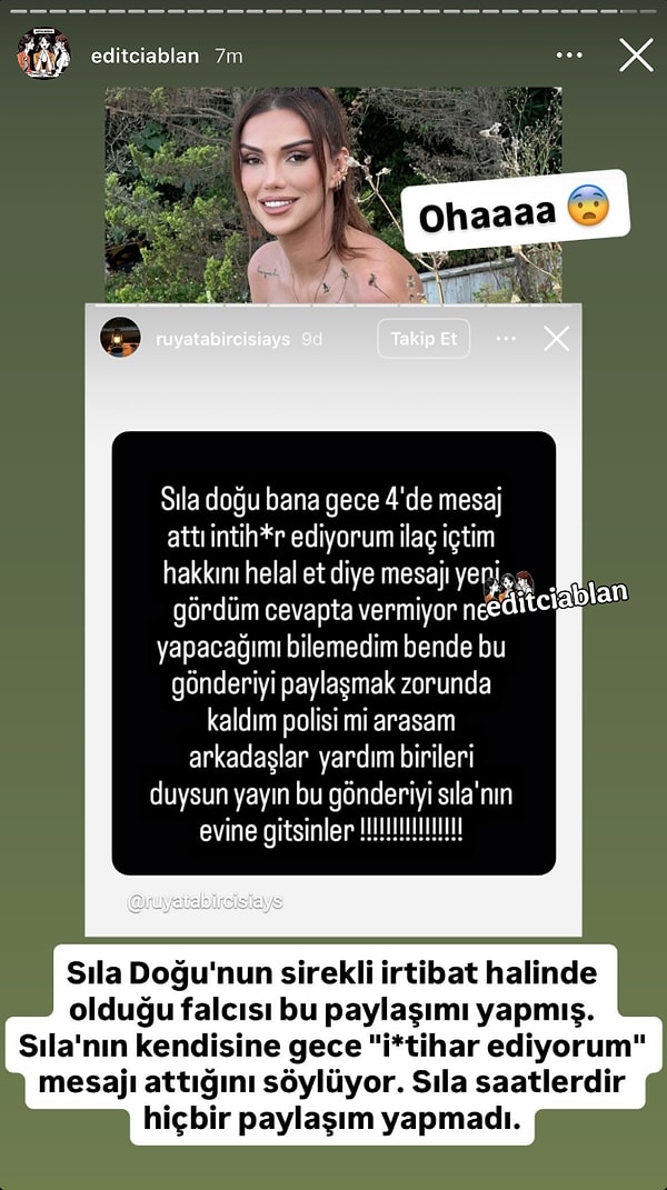 @editciablan’ın paylaşımına nazaran, Sıla Doğu’nun daima irtibat halinde olduğu falcısı, gece saat 04.00’te kendisine Sıla’dan “intihar ediyorum, ilaç içtim, hakkını helal et” biçiminde bir ileti geldiğini öne sürdü.