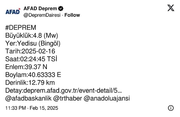 AFAD’ın paylaşımına nazaran Bingöl’de yaşanan 4.8 büyüklüğündeki sarsıntı saat 02.24’te ve yerin yaklaşık 12 kilometre derinliğinde meydana geldi.