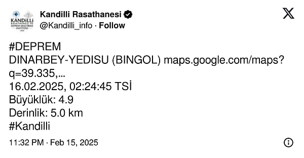 Kandilli Rasathanesi ise sarsıntının büyüklüğünü 4.9 olarak duyurdu. 👇