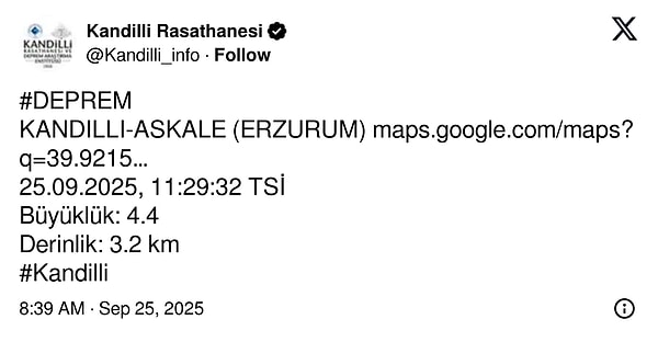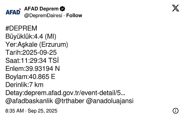 AFAD, Erzurum’ın Aşkale ilçesinde 4.4 büyüklüğünde zelzele meydana geldiğini paylaştı. Kandilli Rasathanesi de sarsıntının büyüklüğünü 4.4 olarak duyurdu.