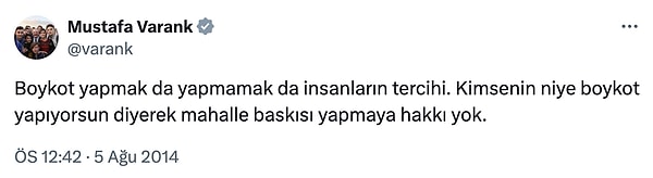 Mustafa Varank’ın 11 yıl evvel attığı tweetinde ‘Boykot yapmak da yapmamak da insanların tercihi. Kimsenin niçin boykot yapıyorsun diyerek mahalle baskısı yapmaya hakkı yok.’ sözleri yer alıyor.