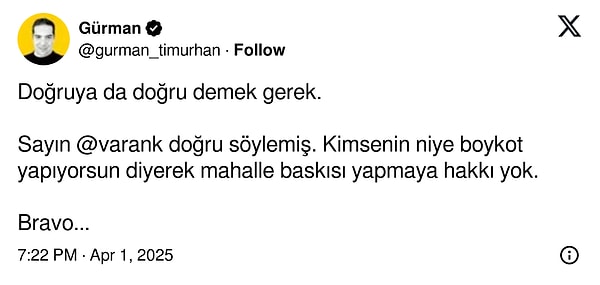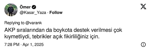 Ekrem İmamoğlu’nun gözaltına alınması ve daha sonra tutuklanmasıyla başlayan protestolara boykotlar eklenmişti. Toplumsal medyada yapılan boykot davetleri sürat kesmeden devam ederken 2 Nisan’da tüketimi büsbütün durdurma duyuruları yapıldı. 2 Nisan boykotu için paylaşımlar devam ederken İstanbul Cumhuriyet Başsavcılığı, boykot çağrılarına ait ‘Nefret ve Ayrımcılık’ ile ‘Halkı Kin ve Düşmanlığa Tahrik’ suçlamalarıyla re’sen soruşturma başlattı. Toplumsal medyada bu kere ‘boykot hakkı’ paylaşımları öne çıkarken Ak Parti milletvekili Mustafa Varank’ın 11 yıl evvel paylaştığı bir tweet gündem oldu.