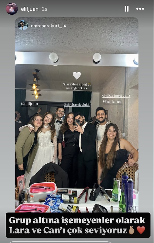Ekipten arkadaşlarının düğününden paylaştıkları fotoğrafta Feyza Civelek’e gönderme yapan Elifcan Şahan, paylaştığı fotoğrafa ‘Grup altına işemeyenler olarak Lara ve Can’ı çok seviyoruz’ notunu düştü. Bahisle ilgili Sibel Taşçıoğlu’dan rastgele bir açıklama gelmedi.