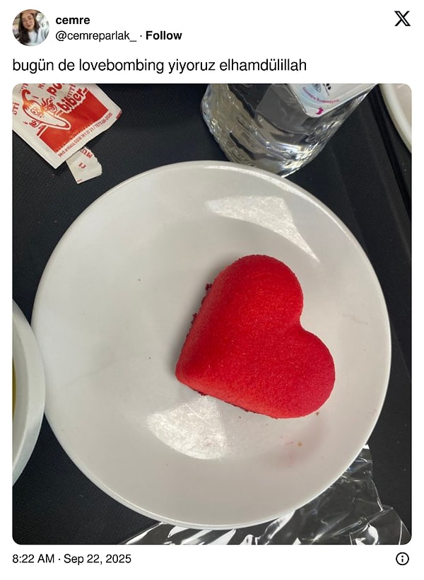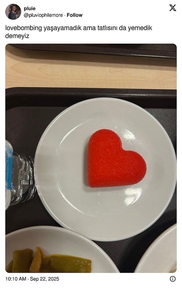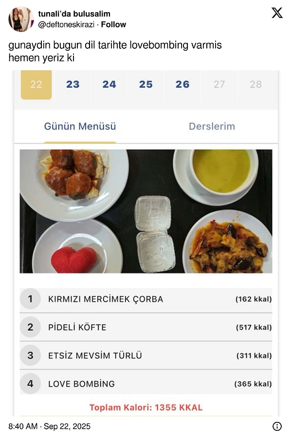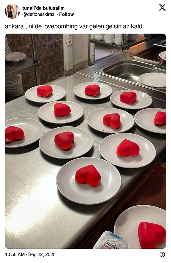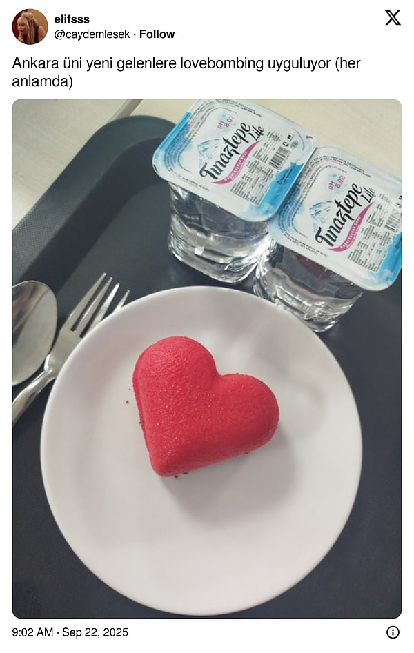 Ankara Üniversitesi öğrencileri, günün menüsünde kalp halinde bir tatlı çıktığını ve isminin da ‘love bombing’ olduğunu paylaştı. Doğal güldüren yorumlar da eksik olmadı.