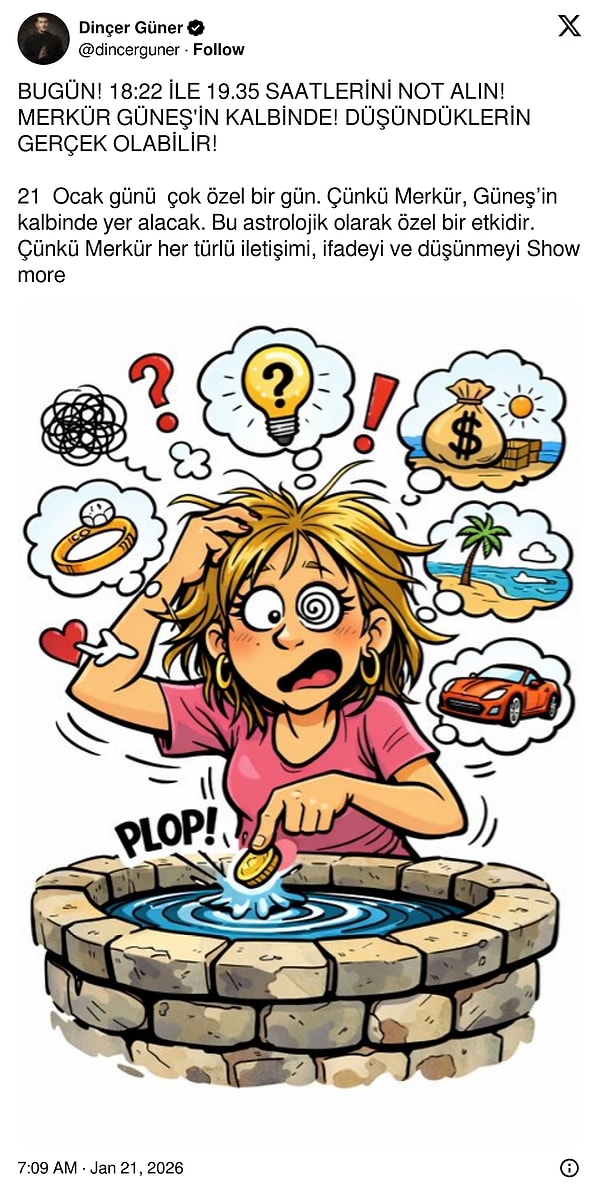 X hesabından paylaşım yapan astrolog Dinçer Güner, bugün dileklerin gerçeğe dönüşebileceğini anlattı. 21 Ocak Çarşamba günü için dilek saatini açıklayan Güner, ‘Bu saatleri not alın’ dedi. Güner, ’21 Ocak günü çok özel bir gün. Zira Merkür, Güneş’in kalbinde yer alacak. Bu astrolojik olarak özel bir etkidir’ sözlerini kullandı.