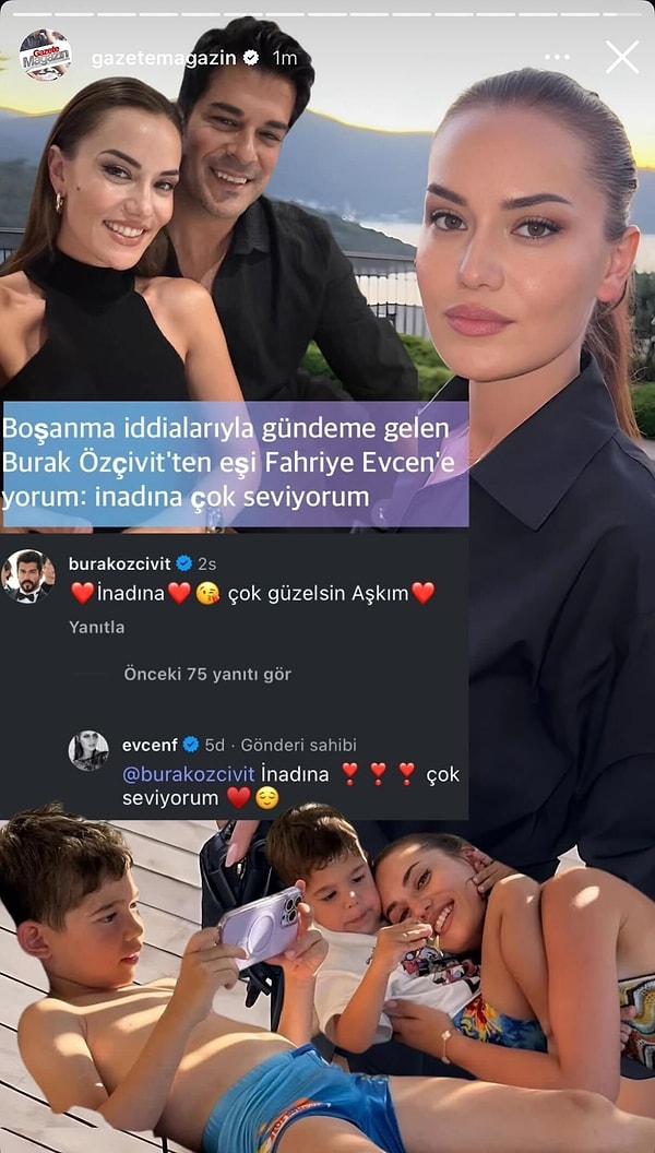 Ancak çift, tüm bu berbat söylentilere karşı inadına aşklarını ve memnunluklarını gözler önüne serdi. Burak Özçivit’in Fahriye Evcen’e “İnadına, çok güzelsin aşkım” sözleri ve aileleriyle birlikte paylaştıkları keyifli kareler, magazin gündemini adeta zıt köşe yaptı.