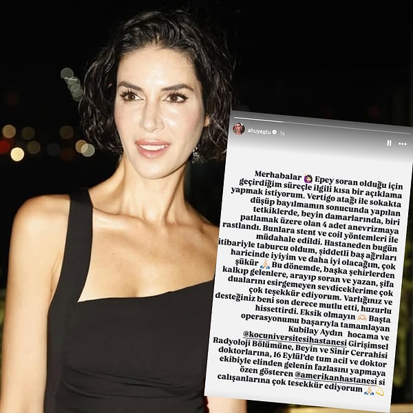 Merhabalar 👋🏻 Oldukça soran olduğu için geçirdiğim süreçle ilgili kısa bir açıklama yapmak istiyorum. Vertigo atağı ile sokakta düşüp bayılmamın sonucunda yapılan tetkiklerde, beyin damarlarımda biri patlamak üzere olan 4 adet anevrizmaya rastlandı. Bunlara stent ve coil usulleri ile müdahale edildi. Hastaneden bugün itibariyle taburcu oldum, şiddetli baş ağrıları haricinde düzgünüm ve daha güzel olacağım, çok şükür 🙏🏻