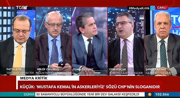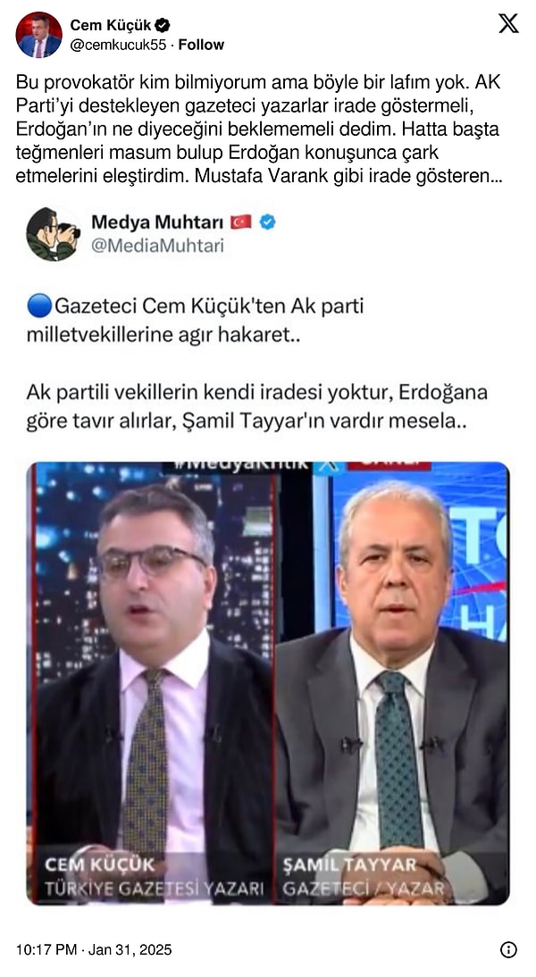 Gazeteci Cem Küçük, TGRT Haber kanalında konuk olduğu programda AK Parti medyasına dair açıklamasıyla gündeme geldi. Küçük, programdaki kelamlarının paylaşılmasıyla Twitter hesabından açıklama yaptı ve aslının olmadığını argüman etti. Programda, “Mustafa Varank, ben ve Fuat Uğur dışında AK Parti medyasında dut yemiş bülbül gibiler” diyerek kelamlarına başlamıştı.