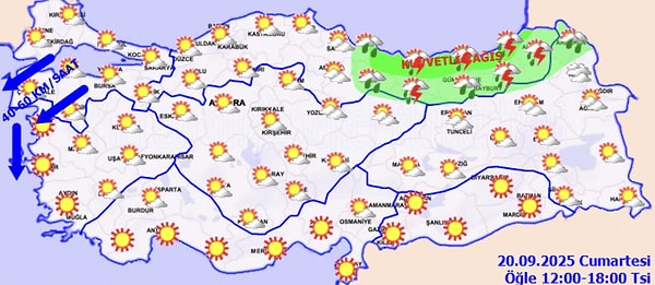 Meteoroloji, 20 Eylül Cumartesi hava durumunu paylaştı. Rapora nazaran ülkenin kuzey, iç ve doğu kesitlerinin kesimli, yer yer çok bulutlu olacak. Doğu Karadeniz ile Sivas, Sinop, Samsun, Ordu, Tokat ve Ardahan etraflarının lokal olmak üzere sağanak ve gök gürültülü sağanak yağış bekleniyor. Yağışların, Doğu Karadeniz kıyıları ile Ordu etraflarında yer yer kuvvetli olması kestirim ediliyor.
