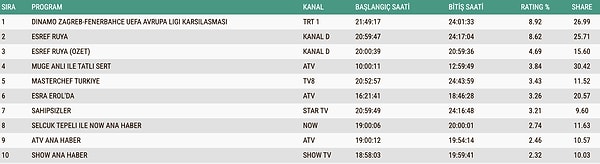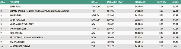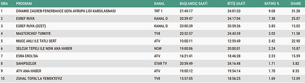 İkinci sırada Eşref Düş, üçüncü sırada ise Eşref Düş’ün özeti yer aldı. MasterChef yükselişe geçerek 4. sırada kendine yer buldu.