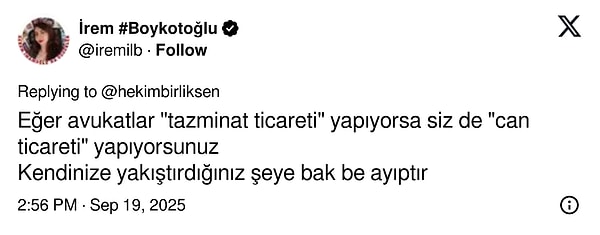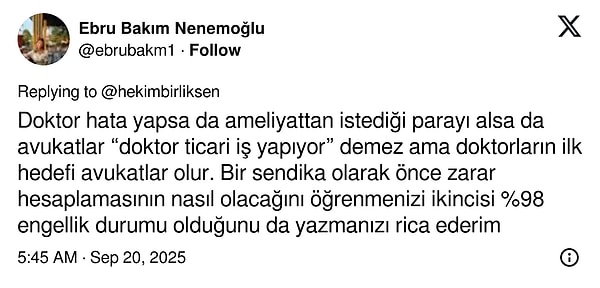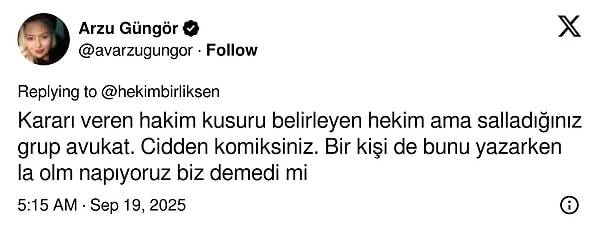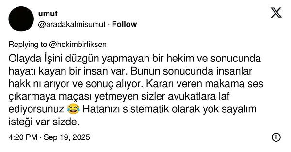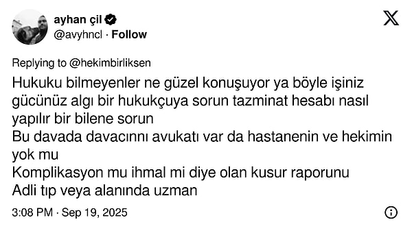 Bir daha da hak ararken biraz aklınızı da başınıza alın. Hekimin yanılgılı olduğu yargı kararıyla sabit lakin kamu sizin yanınızda olsun istiyorsunuz, lakin avukatın bahsettiğiniz üzere kirli ilgiler içerisinde olduğuna dair tek bir emare yokken yaftalıyorsunuz. Türkiye Barolar Birliği @barolar umarım bu açıklamanız gereği hukuksal ve cezai şikayet hakkını kullanır. Tahminen biraz aklınız başına gelir.’