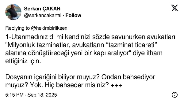 ‘Utanmadınız di mi kendinizi kelamda savunurken avukatları ‘Milyonluk tazminatlar, avukatların “tazminat ticareti” alanına dönüştüreceği yeni bir kapı aralıyor’ diye itham ettiğiniz için.