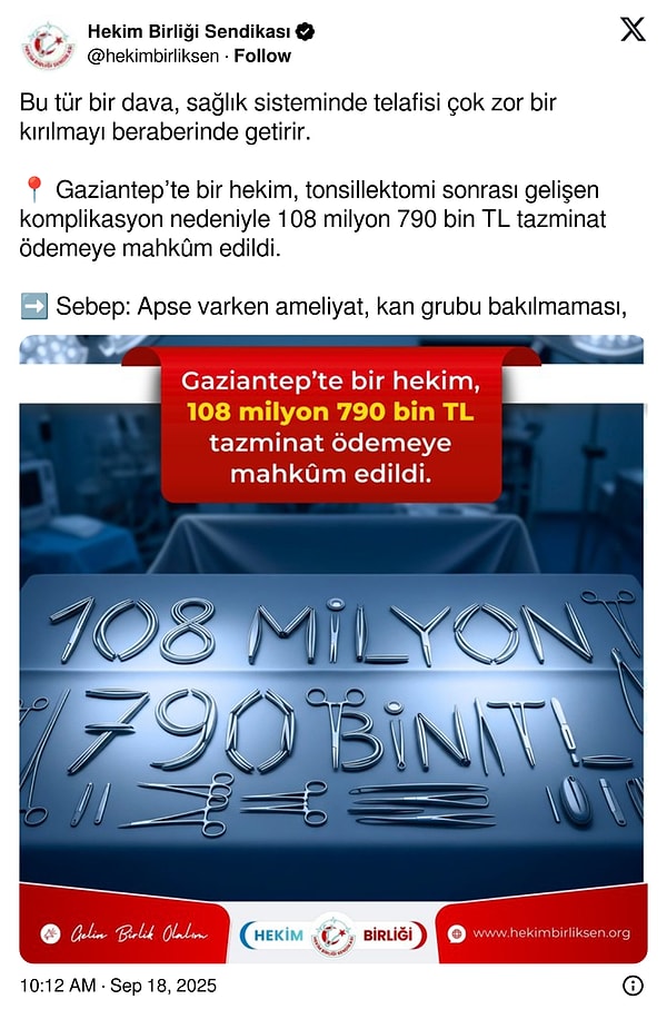 📍 Gaziantep’te bir tabip, tonsillektomi sonrası gelişen komplikasyon nedeniyle 108 milyon 790 bin TL tazminat ödemeye mahkûm edildi.