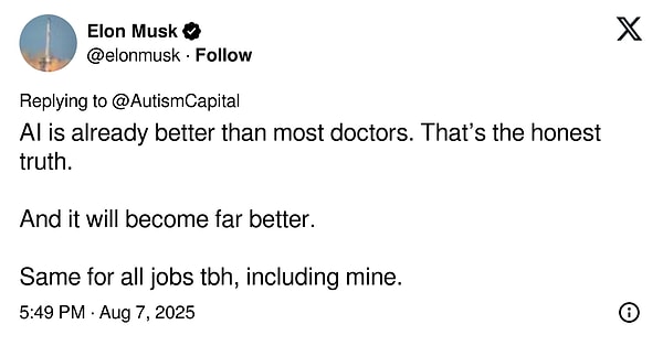 Elon Musk, yapay zekaya dair en net açıklamalarından birini yaptı. X’te (eski Twitter) yaptığı yorumda, yapay zekanın tabiplerden kendi işine kadar tüm meslekleri ortadan kaldıracağını söyledi. Açıklama, OpenAI’ın yeni GPT-5 modelini tanıttığı gün geldi. Musk’ın sözleri hem teknoloji dünyasında hem de toplumsal medyada geniş yankı uyandırdı.