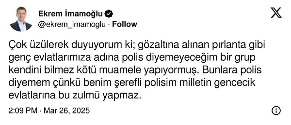 Ekrem İmamoğlu’nun toplumsal medya hesabından yapılan paylaşımda, kimi polislerin gözaltında şiddet uyguladığı vurgulanmıştı.