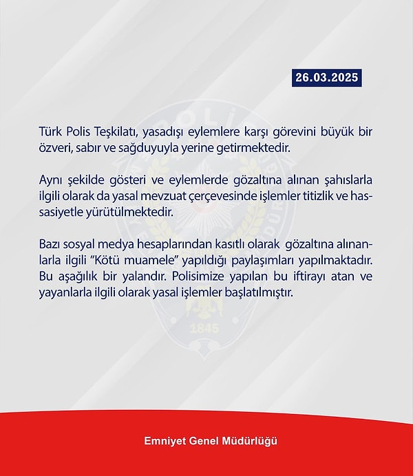 İddiaların “aşağılık bir yalan” olduğunu söyleyen EGM, savları ortaya atılanlar hakkında yasal süreç başlatılacağını da kelamlarına ekledi.