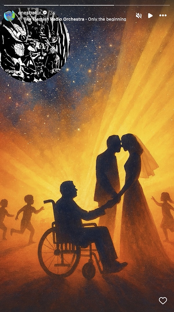 Yeni evli bir çift, birkaç çocuk ve bir de tekerli sandalyede bir adamın silüetini paylaşan Enes Batur’un ne demeye çalıştığı, ne ima ettiği yeniden anlaşılamadı. Lakin bu tekerlekli sandalyedeki adamın elini tutan, tıpkı vakitte da kocasına sarılan gelin vurgusu tuhaf geldi… Hatta rahatsız edici bulundu.