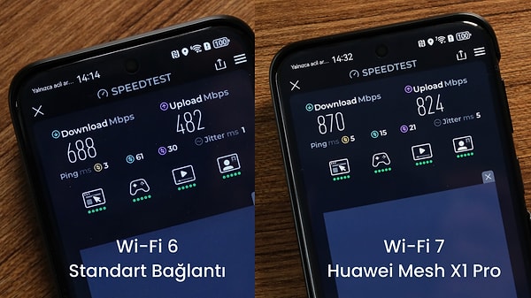 Huawei WiFi BE3 Pro, 2.4 GHz bandında 688 Mbps, 5 GHz bandında ise 2882 Mbps sürat bedellerine ulaşabiliyor. Konut içinde dolaşırken aygıtın akıllı anten sistemi sayesinde sinyal daima sizi takip ediyor; böylelikle “ölü bölgeler” ortadan kalkıyor. İnternet temasınız, konutta olduğunuz pozisyona nazaran değişmeden daima yüksek performans sağlıyor. Biz ofiste test ettiğimizde, ofisimizdeki eser odası ve toplantı odası üzere daha ‘’köşede’’ kalan alanlarda ve tuvalet üzere ofisin merkezine uzak noktalarda da stabil bir kullanım yakaladık.