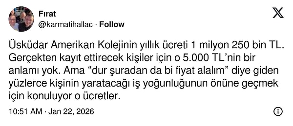 Özel okul fiyatları gündemdeki yerini koruyor. Fiyatlar uçup giderken X yapılan bir paylaşım ise gündem oldu. ‘@hnnddee’ isimli kullanıcı bir ailenin çocuğu için özel okuldan fiyat almak istediğini lakin aradıklarını okulun randevu fiyatı çıkardığını ileri sürdü. Kullanıcının tezine nazaran istenen randevu fiyatı 5 bin TL. İstenen fiyat toplumsal medyayı ikiye böldü. Kullanıcılarda kimileri fiyatı anlamsız bulduğunu belirtirken birtakımı ise randevu fiyatının olması gerektiğini lisana getirdi.
