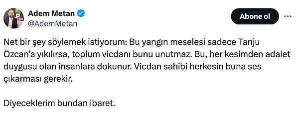 “Net bir şey söylemek istiyorum: Bu yangın problemi yalnızca Tanju Özcan’a yıkılırsa, toplum vicdanı bunu unutmaz. Bu, her kısımdan adalet duygusu olan insanlara dokunur. Vicdan sahibi herkesin buna ses çıkarması gerekir.