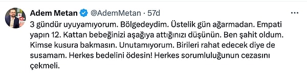 Olayın yaşandığı birinci andan bu yana olay yerinde olan gazeteci Adem Metan da hislerini X hesabından paylaştığı iletiyle anlattı.
