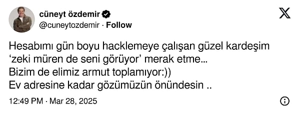 Hesabını hacklemeye çalışanlara sert bir ileti veren Özdemir, “Bizim de elimiz armut toplamıyor” diyerek, “Ev adresine kadar gözümüzün önündesin” kelamlarıyla gözdağı verdi.