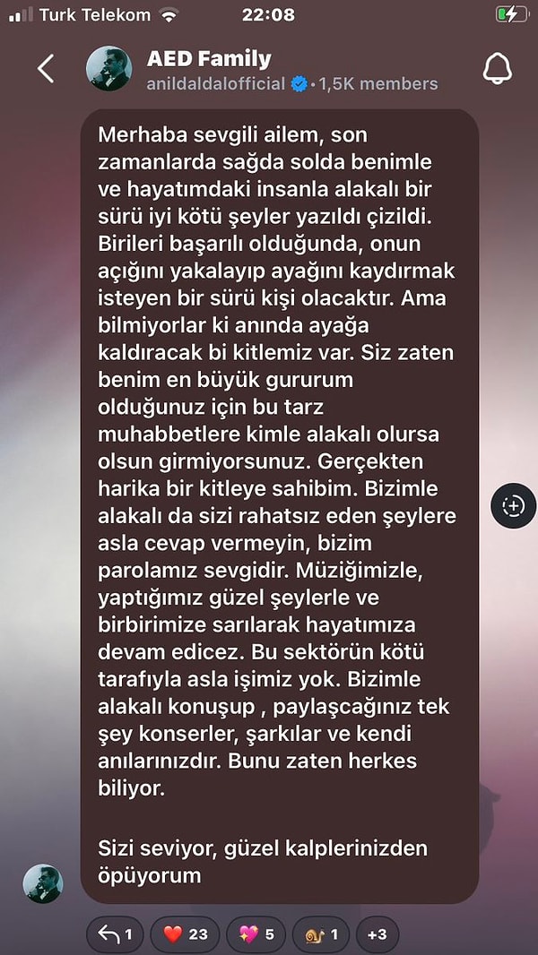 “Merhaba sevgili ailem, son vakitlerde sağda solda benimle ve hayatımdaki beşerle alakalı bir sürü uygun berbat şeyler yazıldı çizildi. Birileri başarılı olduğunda, onun açığını yakalayıp ayağını kaydırmak isteyen bir sürü kişi olacaktır. Ancak bilmiyorlar ki anında ayağa kaldıracak bi kitlemiz var. Siz esasen benim en büyük gururum olduğunuz için bu şekil muhabbetlere kimle alakalı olursa olsun girmiyorsunuz. Sahiden olağanüstü bir kitleye sahibim. Bizimle alakalı da sizi rahatsız eden şeylere asla yanıt vermeyin, bizim parolamız sevgidir. Müziğimizle, yaptığımız hoş şeylerle ve birbirimize sarılarak hayatımıza devam edeceğiz. Bu dalın makus tarafıyla asla işimiz yok. Bizimle alakalı konuşup, paylaşacağınız tek şey konserler, müzikler ve kendi anılarınızdır. Bunu zati herkes biliyor.Sizi seviyor, hoş kalplerinizden öpüyorum.”