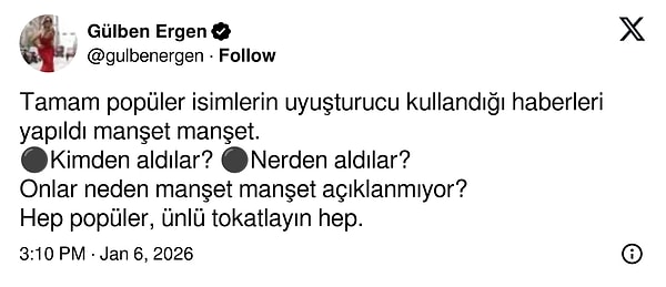 Ergen, ünlülere yönelik düzenlenen uyuşturucu operasyonu haberlerinin manşetlerinde daima ünlülerin yer almasına isyan etti.