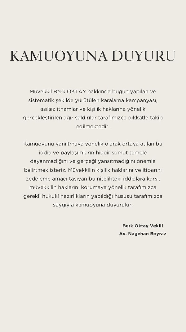 Müvekkil Berk Oktay hakkında bugün yapılan ve sistematik halde yürütülen karalama kampanyası, temelsiz ithamlar ve kişilik haklarına yönelik gerçekleştirilen ağır akınlar tarafımızca dikkatle takip edilmektedir.Kamuoyunu yanıltmaya yönelik olarak ortaya atılan bu tez ve paylaşımların hiçbir somut temele dayanmadığını ve gerçeği yansıtmadığını değerle belirtmek isteriz. Müvekkilin kişilik haklarını ve prestijini zedeleme maksadı taşıyan bu nitelikteki savlara karşı, müvekkilin haklarını muhafazaya yönelik tarafımızca gerekli hukuksal hazırlıkların yapıldığı hususu tarafımızca hürmetle kamuoyuna duyurulur.