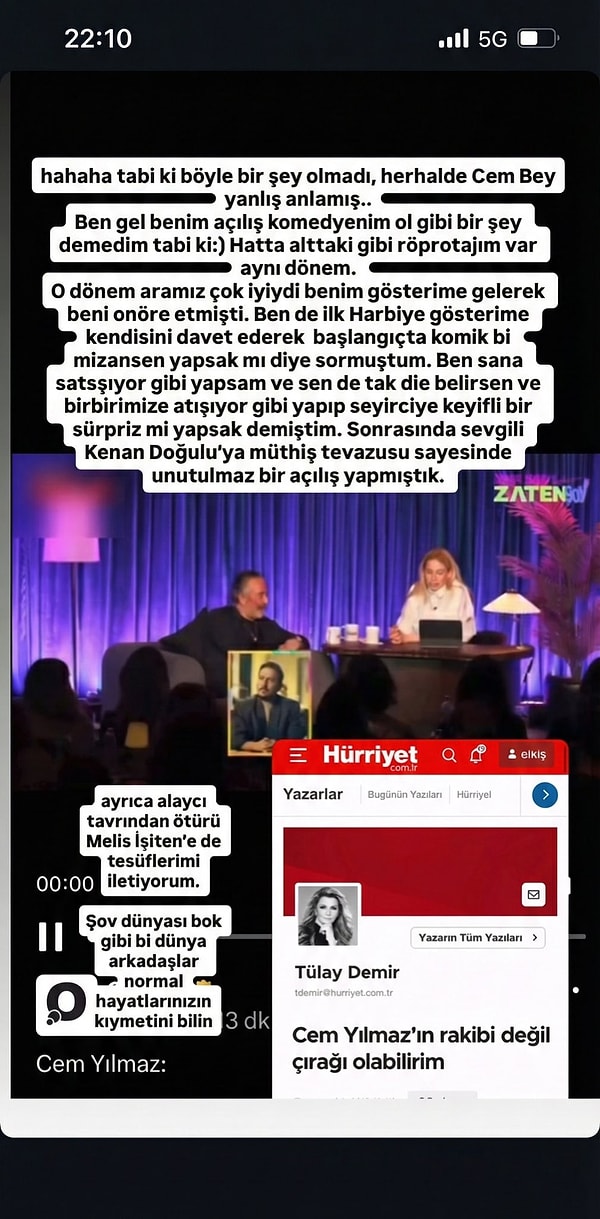 Cem Yılmaz da hepinizin bildiği üzere Türkiye’de muvaffakiyetini kanıtlamış komedyenlerden. Cem Yılmaz, Melis İşiten’in programında Kaan Sekban için, ‘Kaan Sekban, Harbiye’deki gösterisini onun için benim açmamı istemiş. Yapmadım.Yapmadığım için darılmış olabilir.’ sözlerini lisana getirdi ve ortalık karıştı. Program kısa müddette viral oldu, İşiten’in şaşkınlığı da dikkat çekti.