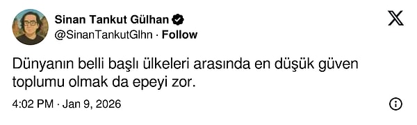 Verilere nazaran Türkiye, toplumsal itimadın en düşük olduğu ülke olarak görünüyor. Türkiye’de “İnsanlara güvenilir” diyenlerin oranı yüzde 14 oldu. “Güvenilmez” diyenlerin yüzde 84’ü olarak kayıtlara geçti.