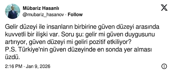 Pew Research Center’ın yayımladığı son araştırma, ekonomik refah ile toplumsal bağlar ortasındaki sarsıcı ilgiyi gözler önüne serdi. “İnsanlara güvenebilir misiniz?” sorusunun yöneltildiği araştırmanın sonucu ‘Sosyal inanç güçlü ülkelerde daha yüksek, orta gelirli ülkelerde daha düşüktür” başlığıyla yayımlandı. Listenin birinci sıralarını ekonomik refah seviyesi yüksek ülkeler oluşturdu. İnsanların birbirine en çok güvendiği ülke İsveç oldu. İsveç’i Hollanda ve Kanada takip etti.