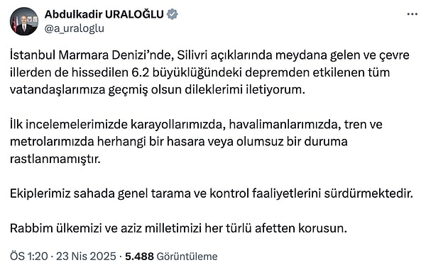 AFAD’ın merkez üssünü Silivri olarak açıkladığı sarsıntı sonrası Ulaştırma ve Altyapı Bakanı Abdulkadir Uraloğlu’ndan açıklama geldi.