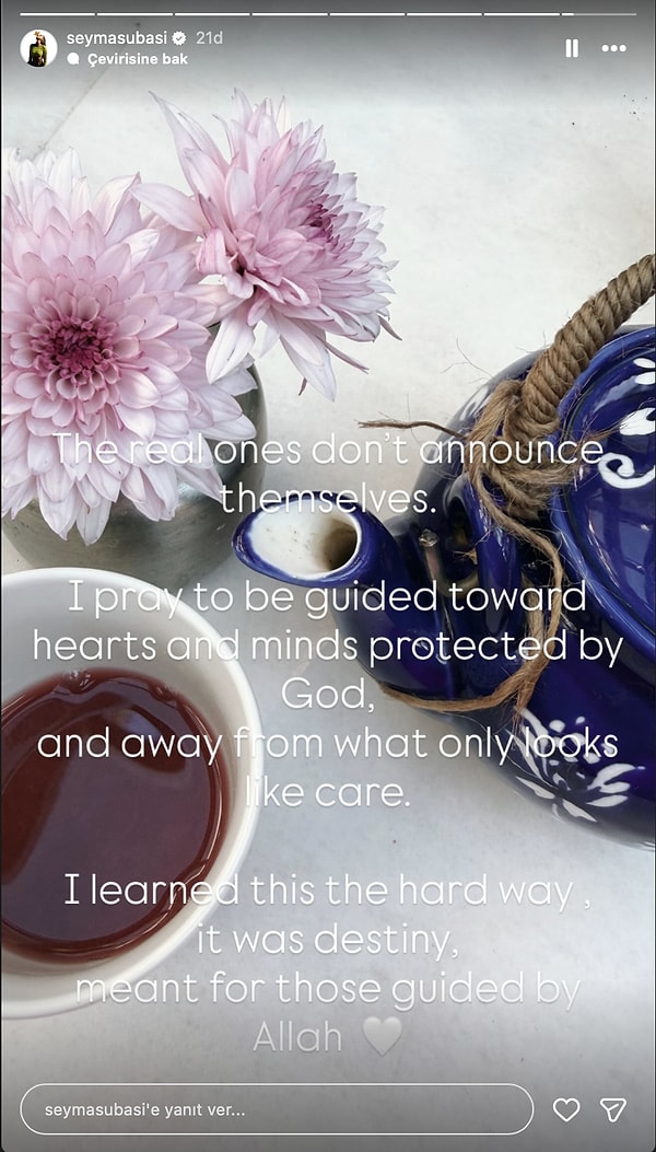 Allah’a sığındığını belirten Şeyma Subaşı, ‘Gerçek olan beşerler kendilerini ilan etmez. Allah tarafından korunmuş kalplere ve zihinlere yönlendirilmeyi diliyorum; sırf ‘ilgi’ üzere görünen şeylerden de uzak durmayı…