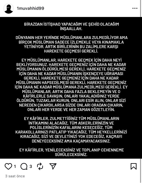 Olaydan 3 saat evvel Instagram’dan yapılan bir paylaşım toplumsal medyada gündem oldu. 1muvahhid99 kullanıcı isimli bir kişi, yaptığı paylaşımda “Birazdan iştihad yapacağım ve şehit olacağım” sözlerini kullandı.
