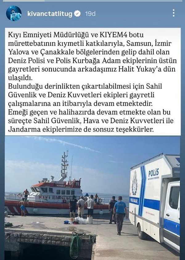İş insanı Halit Yukay Yalova’dan Bozcaada’ya gitmek üzere denize açılmış lakin teknesi parçalanmış ve yarı batık halde bulunmuştu. Arama çalışmalarının üstünden tam 19 gün geçmesinin akabinde acı haber geldi. Halit Yukay’ın cansız vücuduna ulaşıldı. Kendisiyle son bağlantı kuran kişi olduğu ortaya çıkan Kıvanç Tatlıtuğ, yakın arkadaşının vefat haberinin akabinde birinci paylaşımı yaptı.