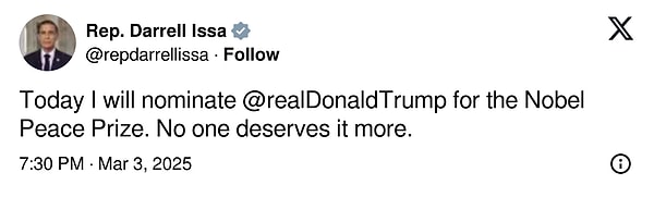 Cumhuriyetçi Kongre Üyesi Darrell Issa, Trump’ı Nobel Barış Ödülü’ne aday göstereceğini açıkladı!