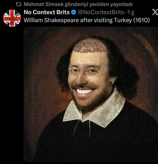 Bakan Mehmet Şimşek, X (Twitter) hesabından sıra dışı bir paylaşımı yine yayımlayarak dikkat çekti. Şimşek, ‘No Context Brits’ isimli hesabın paylaştığı saç ekim görselini takipçileriyle tekrar paylaştı. Şimşek’in retweet ettiği gönderide, “Türkiye’yi ziyaret ettikten sonra William Shakespeare (1610)” sözleri yer alırken Shakespeare’in mizahi biçimde dönüştürülmüş bir portresi yer aldı.