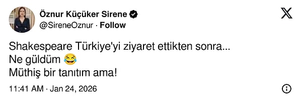 Hazine ve Maliye Bakanı Mehmet Şimşek, sosyal medya hesabından yaptığı dikkat cazip bir paylaşımda bulundu. Bakan Şimşek, ‘Türkiye’yi ziyaret ettikten sonra William Shakespeare” notuyla yayımlanan mizahi bir görseli RT etti (yeniden paylaştı). Şimşek’in paylaşımını görenler goygoyu da elden bırakmadı. İşte Şimşek’in tekrar paylaştığı o gönderi ve gelen yorumlar.