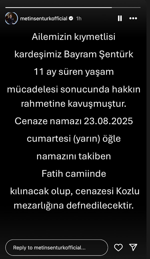 Metin Şentürk, Instagram hesabından yaptığı paylaşımda kardeşi Bayram Şentürk’ün 11 ay süren hayat gayretinin akabinde vefat ettiğini duyurdu.