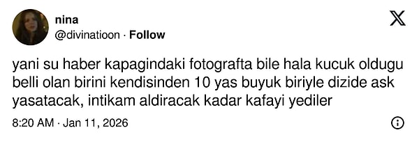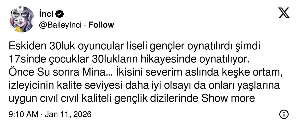 Özellikle son iki dönemdir dizilerdeki partnerlikler izleyiciler tarafından eleştiriliyor. Erkek oyuncuların yaşça bayan oyunculardan büyük olması izleyicilerin dikkatini çekiyor ve izleyicilerin ortadaki büyük yaş farkına reaksiyon göstermesine yol açıyor. Simay Barlas ve Onur Tuna, Afra Saraçoğlu ve Kenan İmirzalıoğlu, Lizge Cömert ve Kerem Bürsin, Cemre Baysel ve Murat Yıldırım, Sıla Türkoğlu ve İbrahim Çelikkol’un akabinde Mina Demirtaş ve Mert Ramazan Demir’in partner olması toplumsal medyayı yine ayağa kaldırdı.