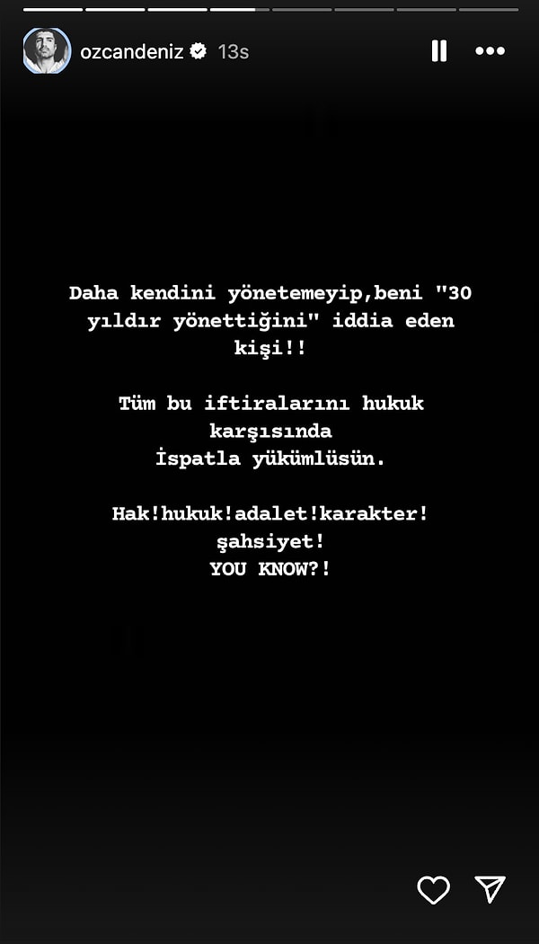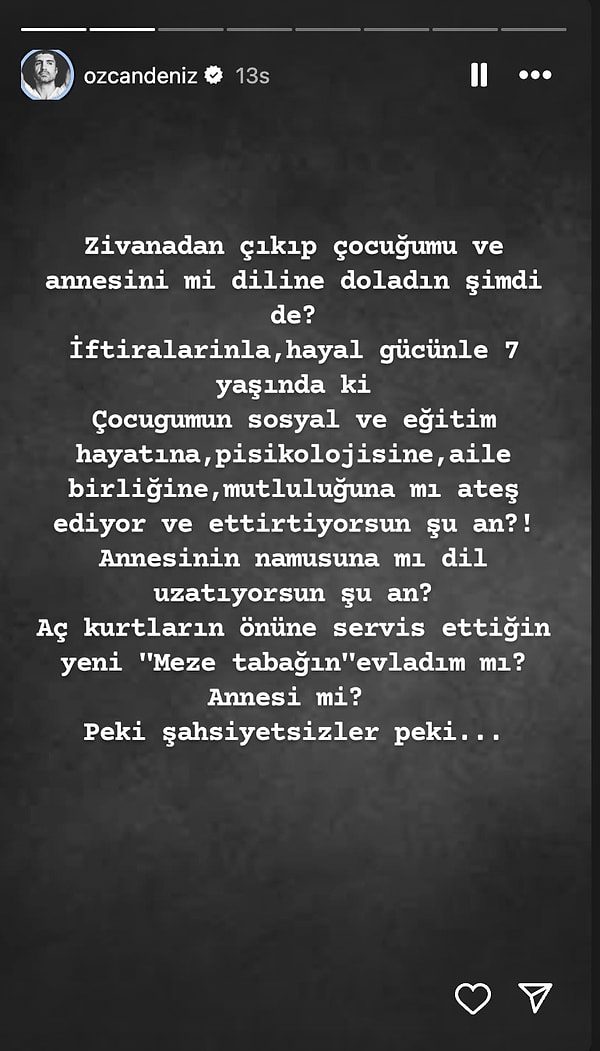 Özcan Deniz, Instagram hesabından yaptığı açıklamada ağabeyinin kelamlarına sert çıktı. Çocuğunun ve annesinin onuruna lisan uzatıldığını belirterek, “7 yaşındaki evladımın psikolojisine mi ateş ediyorsun? Annesinin namusuna mı lisan uzatıyorsun?” tabirlerini kullandı. Kardeşinin tezlerini ağır sözlerle eleştiren Deniz, bu durumu “aç kurtların önüne atılan meze” olarak nitelendirdi.