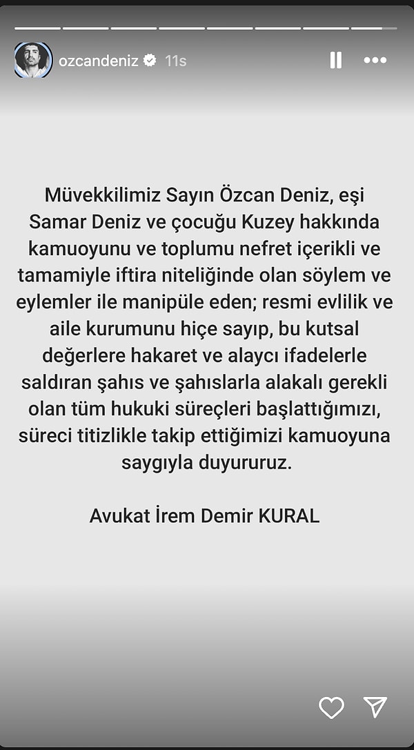 Avukatı İrem Demir Kural aracılığıyla yapılan duyuruda, Özcan Deniz’in eşi Samar Dadgar ve oğlu Kuzey hakkında söylenenlerin nefret içerikli ve iftira niteliğinde olduğu vurgulandı. Açıklamada, aile kurumuna yönelik hakaret ve alaycı sözler nedeniyle gerekli tüm türel süreçlerin başlatıldığı ve davanın titizlikle takip edileceği belirtildi. Böylelikle Özcan Deniz, bu tartışmayı sırf kelamlı değil, resmî olarak da adalet önüne taşımış oldu.